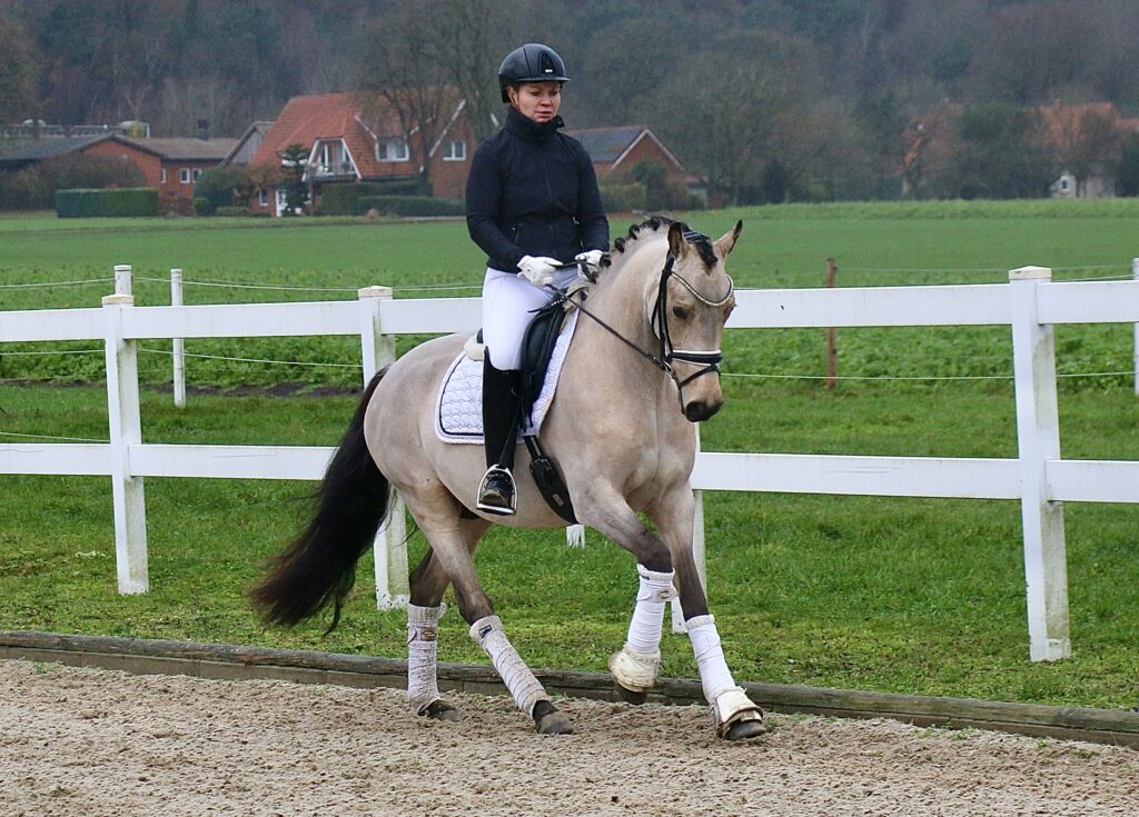 | DR | Wallach | Buckskin | *2022 | 148 cm v. Charmeur x Benedict „Cinzano“ ist ein 3-jähriges Pony mit dem entsprechenden Wow-Faktor, bereits auf den ersten Blick kann er begeistern. Erst seit wenigen Monaten unter dem Sattel kann er bereits jetzt mit seiner unerschrockenen Art und Nervenstärke überzeugen. Egal ob Halle oder Platz,…